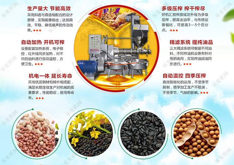 因此,發(fā)展油脂工業(yè),滿足日益龐大的市場需求,我們經(jīng)過長期的市場調(diào)查與研究,研制開發(fā)了先進(jìn)的自動(dòng)化中小型榨油設(shè)備,獲得了國家多項(xiàng)榮譽(yù),產(chǎn)品經(jīng)“國家糧油加工機(jī)械質(zhì)量監(jiān)督檢驗(yàn)中心檢驗(yàn)合格”,是廣大用戶購買榨油設(shè)備的理想選擇。