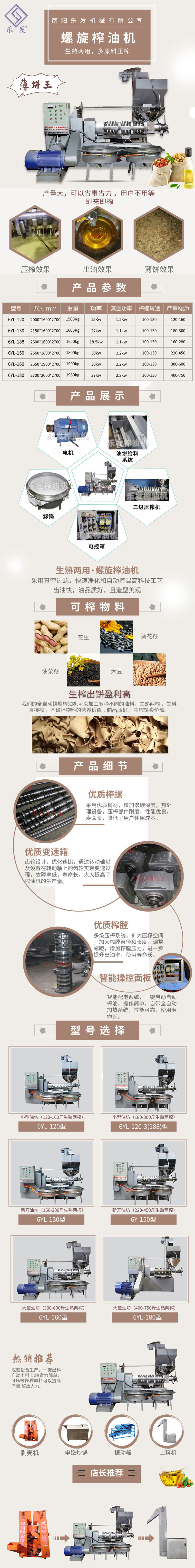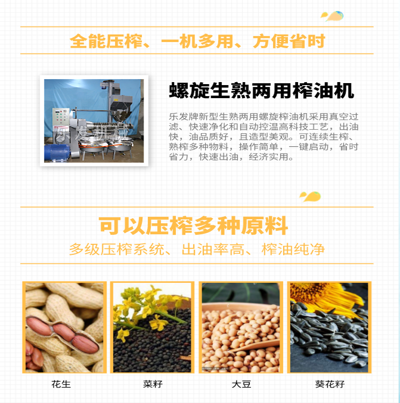 確定好物料后,然后選擇榨油機廠家,目前榨油機的生產(chǎn)技術(shù)已經(jīng)非常成熟,大家只要認準(zhǔn)正規(guī)的生產(chǎn)廠家,售后服務(wù)有保障的都是可以的,樂發(fā)牌榨油機專注榨油機行業(yè)20余年,憑借技術(shù)精良、完善的服務(wù)及優(yōu)良的口碑傳播占領(lǐng)國內(nèi)市場,已出口產(chǎn)品國內(nèi)外全球,主要生產(chǎn)螺旋榨油機,液壓榨油機,各種相關(guān)榨油機配件產(chǎn)品。經(jīng)過20多年的辛勤探索,南陽樂發(fā)建立了一套完備有效的服務(wù)體系,打造了一支經(jīng)驗豐富的服務(wù)團隊,為客戶提供技術(shù)培訓(xùn),而且派技術(shù)人員現(xiàn)場指導(dǎo)安裝和調(diào)試設(shè)備。我司二十余載的拼搏與奮斗,成就了井然有序、開拓進取的"樂發(fā)"牌,也走出了一條高新產(chǎn)品、經(jīng)濟效益與環(huán)境保護可持續(xù)發(fā)展的樂發(fā)"特色之路,樂發(fā)糧油機械愿以更新的技術(shù),更高的質(zhì)量,更好地服務(wù)廣大新老用戶,真誠合作,再創(chuàng)輝煌!